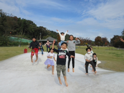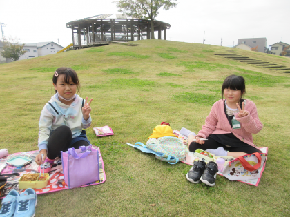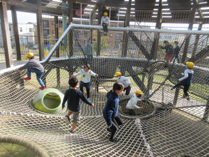 次に呉羽丘陵多目的広場に行き、お昼ご飯を食べました。子供たちは、とても楽しみにしていたお弁当を嬉しそうに食べていました。昼食後、アスレチックで思いっきり遊びました。