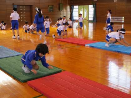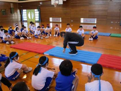 今日の体育は、マットの上をうさぎ跳びで移動しました。ひざと腕の位置が違う2通りの跳び方を練習しました。開脚跳びと抱え込み跳びそれぞれに合った体の動きを意識していました。