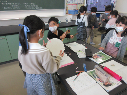 理科では、大きい音と小さい音の物のふるえ方の違いを調べました。シンバルやトライアングル、カスタネットを使って、大きい音と小さい音を出し、ふるえ方にどのような違いがあるか実験しました。