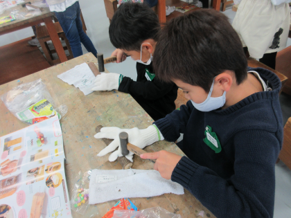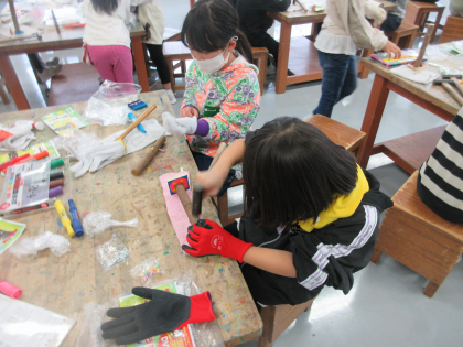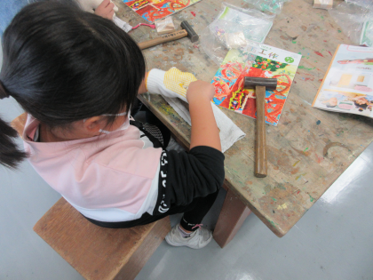図画工作科では、「げんのう」を使って木にくぎを打ち、立体作品を作っています。初めてのげんのうとくぎを扱う授業でしたが、子供たちは少しずつ使い方に慣れてきました。くぎを生き物の顔や足に見立てたり、木と木をうまくつなぎ合わせたり、たくさんの工夫が見られました。