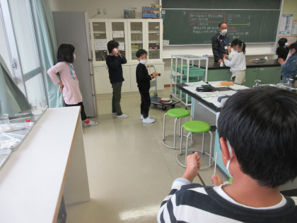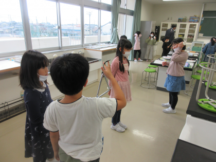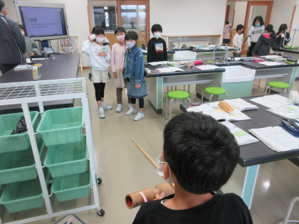 理科では、音が伝わるとき、音を伝える物がふるえているか実験しました。楽器と紙コップを糸でつなげ、楽器を鳴らしたときの糸の動きや紙コップから音が聞こえるかを調べました。