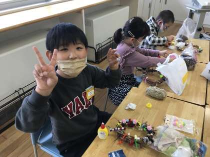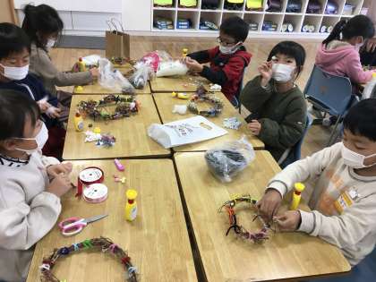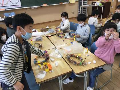 生活の時間にアサガオのリースづくりをしました。いろいろな飾りをつけて、かわいらしいリースをつくっていました。