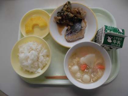 今日の給食は、ごはん、牛乳、鰆の塩焼き、しらたきのピリ辛いため、しらたま汁、カットパインです。
