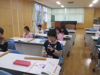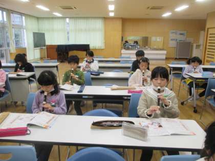 合唱の発表を終え、音楽の学習は久しぶりのリコーダーです。姿勢や指づかい、息の強さを確認し、優しい音が出るように練習しました。