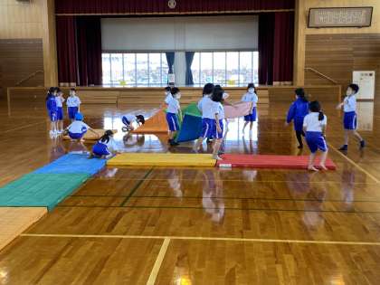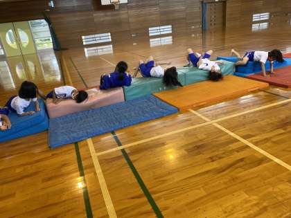 体育の時間にマット遊びをしました。今日でマット遊びは最後なので、今までの活動を生かし、自分たちでコースを作りました。みんな楽しそうにいろいろな転がり方をしていました。