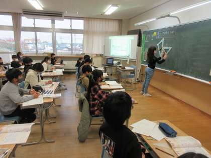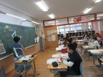 算数の時間に、三角定規を使って垂直な線の描き方を学習しました。たくさんの友達の考えを見聞きするうちに、「分かった!」とつぶやく子供がたくさん。三角定規の直角を使えばよいことを理解することができました。