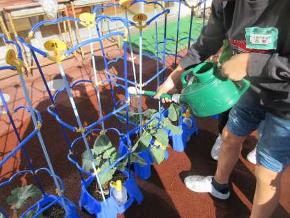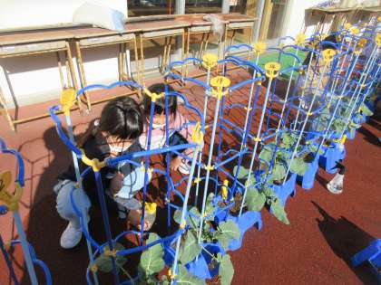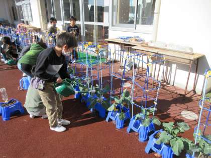 10月末に植えたブロッコリーの苗が大きくなりました。みんな毎日様子を観るのを楽しみにしています。ブロッコリーの葉が、水をよくはじく様子を発見して大喜びでした。