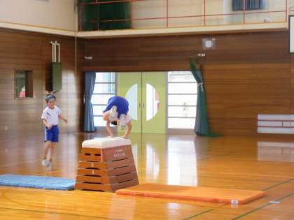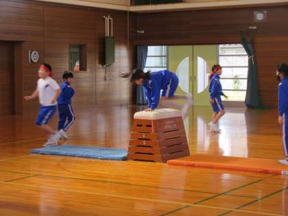 宿泊学習の翌日にもかかわらず、4年生は元気です。体育の時間には、自分の体をできるだけ高くして跳び箱を跳び越えたり、まっすぐに前転したりする練習をしました。繰り返すたびにこつをつかんでいました。
