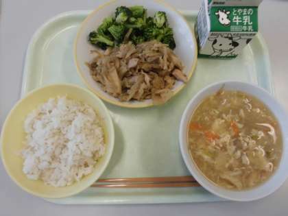 今日の給食は、麦ごはん、牛乳、スタミナレバー丼、ゆでブロッコリー、中華かきたまスープです。