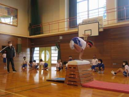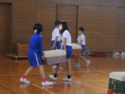 これまで、開脚跳び・抱え込み跳び・台上前転・横跳び等、練習を重ねてきました。今日は、自分がどれだけできるか、一人ずつ跳んでみました。あと少しで跳べそうな友達には「惜しいよ。もうちょっと」と応援の声、跳べるようになった友達には惜しみない拍手を送る子供たち。お互いの成長を喜んでいました。「楽しかった!」と話す子供が多く、満足した表情でした。