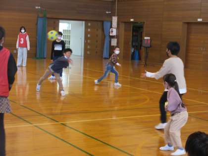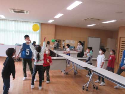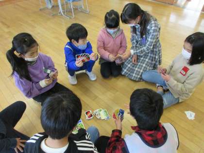 1〜6年生の縦割り班で集まり、トランプやドッジボール等のいろいろな遊びをしました。6年生は、1〜5年生が楽しんでくれるようにと考え、遊びのルールを工夫したり事前に準備をしたりしました。