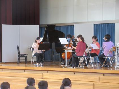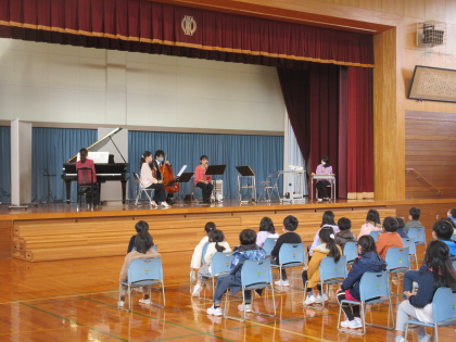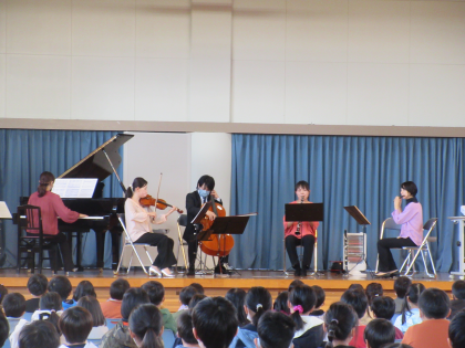 本日、県文化振興財団主催の学校コンサートを開催しました。「ピアノと管弦楽器によるアンサンブル」として、ピアノ、ヴァイオリン、チェロ、フルート、クラリネットの生の演奏を聴かせていただきました。子供たちは、集中して演奏を聴き、いろいろな楽器の音色や曲に親しんでいました。コンサートの後、各教室では友達同士で楽しそうに感想を話し合っていました。