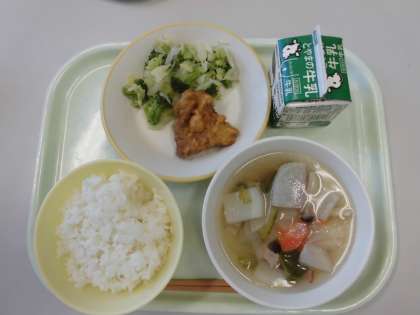 今日の給食は、ごはん、ポークパコラ、そえやさい、かぶのスープ、牛乳です。
