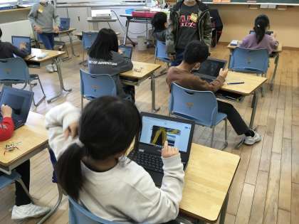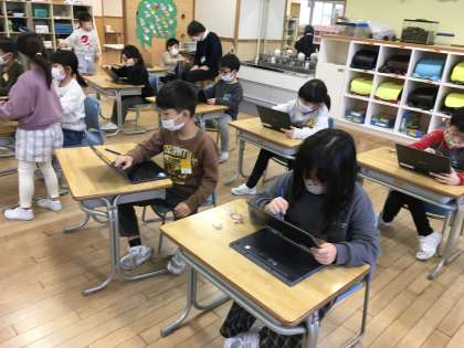 図工の学習で、すきまちゃんと一緒にいろんな隙間を探して写真に絵を描きました。友達と一緒に探したり、前に撮った隙間とは別の隙間を探したりしながら楽しく活動しました。