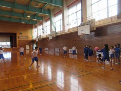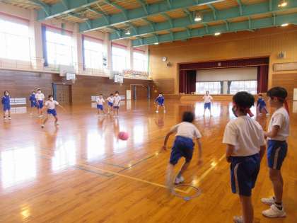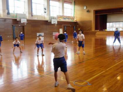きょうは、実際にゲームをしながら、ルールを覚えていきました。ベースボール型のゲームで難しいのは、フライが上がった時の走塁の仕方です。ゲームを進めながら、このような場合はどうしたらよいかを考えていくうちに、少しずつルールを理解していったようです。