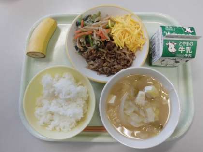 今日の給食は、ごはん、ビビンバ(やきにく ナムル きんしたまご)、みそしる、バナナ、牛乳です。