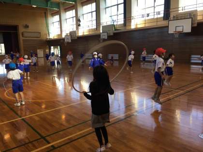 1年生と2年生で体育の学習になわとびあそびをしました。1年生と2年生が関わり合って楽しく活動することができました。