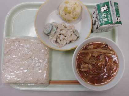 今日の給食は、ソフト麺、ソフト麺の五目あんかけ、蒸しパン、れんこんサラダ、牛乳です。