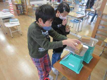 今日の算数科では、はかりの使い方を学習しました。休み時間になると、学習したことを生かそうと、はかりを使う子供たちがいました。積み木や筆記用具など、どれくらいの重さなのかを調べていました。