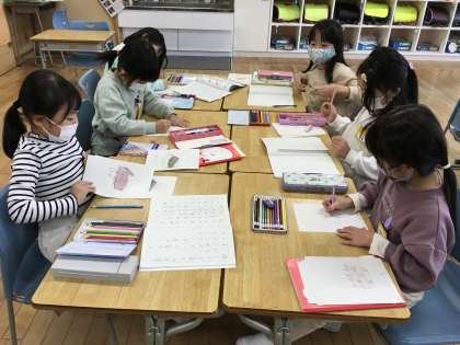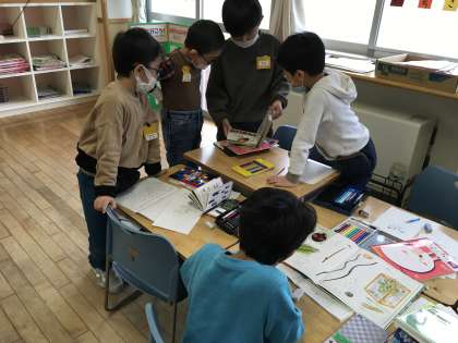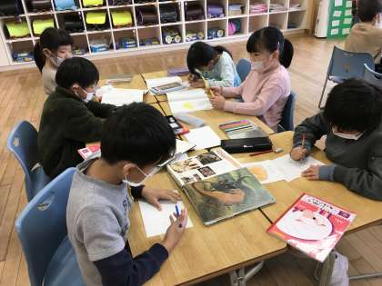 国語の学習でお店屋さんを開く準備をしています。まとめてつけた名前や一つ一つの名前を意識して、自分のお店に並べる商品の絵を描きました。