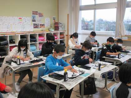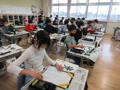 今日は、「光る立山」のはじめの2文字を練習しました。漢字とひらがなの大きさのバランスやそれぞれの画の書き方を確認した後、集中して書きました。
