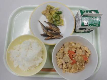 今日の給食は、ごはん、親子煮、こあじのから揚げ、はくさいひたし、牛乳です。