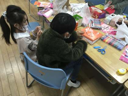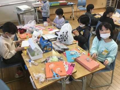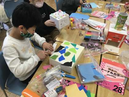 図工で「かざってなにいれよう」という学習をしました。自分が大切にしたいものを想像し、モールや色紙などの飾りを使って、自分だけの素敵な箱を作りました。