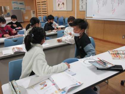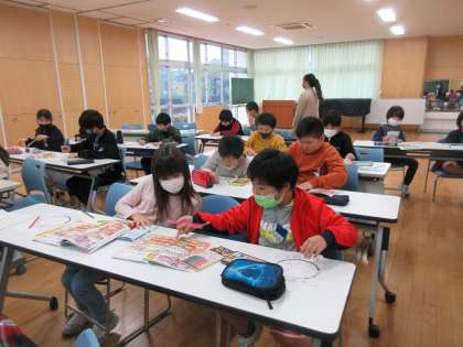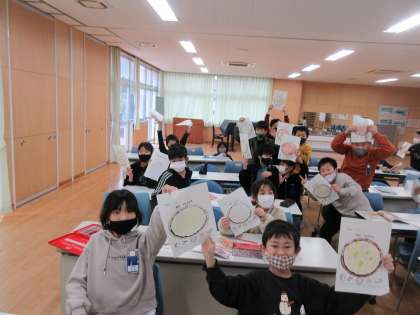 外国語活動の時間は、野菜や果物の名前を覚えたり、「何が欲しいか」「いくつ欲しいか」と尋ねたり答えたりする練習をしています。もう言い方を覚えたので、やりとりもスムーズです。今日は、ピザに載せる具材を友達にインタビューしながら、絵に表しました。相手の注文通りのピザに仕上げようと、熱心に聞いていました。