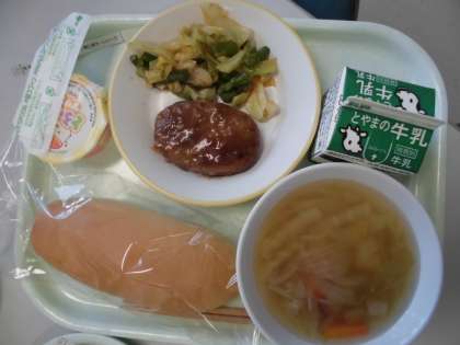 今日の給食は選択献立です。コッペパン・牛乳・ひよこ豆のスープ・アスパラサラダ・魚の香草フリッターまたは照り焼きハンバーグ・ガトーショコラまたは豆乳プリンです。子供たちは選択献立を楽しみにしていた様子です。特にハンバーグとガトーショコラが人気でした。