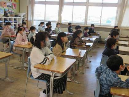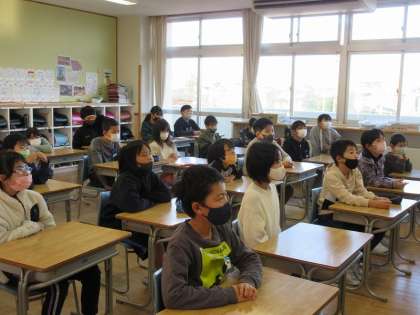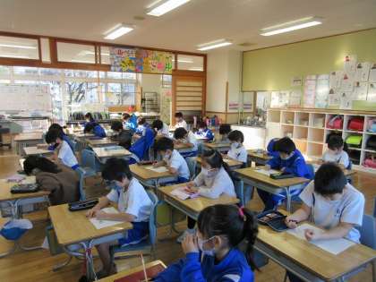今朝、人権についての校内放送がありました。生徒指導担当の先生による、言葉遣いや友達への接し方についての話を、子供たちは真剣な表情で聞いていました。お話の後、子供たちはこれまでの自分を振り返り、これから実行したいことについてカードに書きました。
