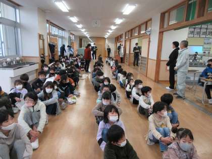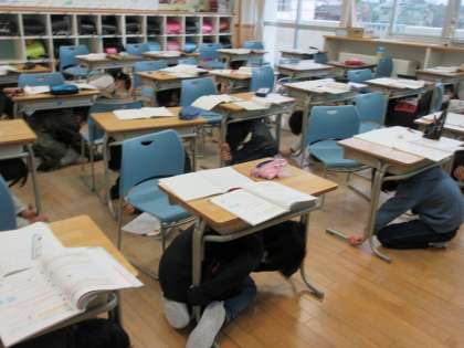 今回は、地震後の津波発生に備えて避難するものでした。子供たちは、地震の合図とともに、机の脚をしっかりと持って、身(主に頭部)を守る行動を取ることができました。その後、3階に避難して先生の講評を聞きました。訓練後、子供たちは「家に帰ったら、ハザードマップで確かめてみよう」と社会科の学習と結び付けて振り返っていました。