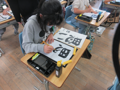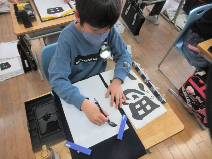 書写では、書初大会に向けて「思いやり」を練習しています。子供たちは、手本をよく見て、字のバランスに気を付けながら集中して書いていました。