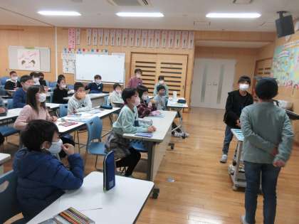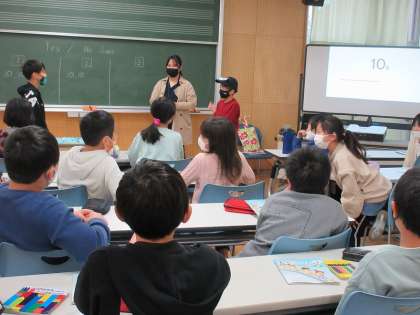 今日の外国語活動は、学習してきた野菜や果物の名前を使ったゲームをしました。自分がかぶっている帽子に貼られた野菜や果物の名前を当てるのですが、制限時間までにいくつでも名前を言っていいので、みんな覚えた名前をたくさん言って当てようとがんばりました。