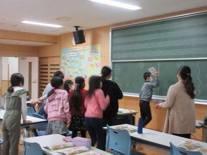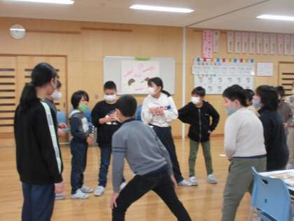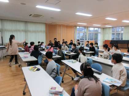 外国語活動の時間に、アルファベットを使ったゲームをしました。伝言ゲームのように問題のカードに書いてあるアルファベットを伝えていき、最後の人がそのアルファベットの文字を選ぶというものです。せっかく正しく伝わったのに、nとmを間違えたりgかzか迷ったり、意外に難しいゲームでした。でも、みんな楽しそうでした。