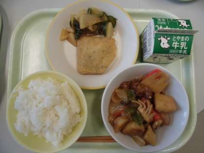 今日の給食は、ごはん・牛乳・しのだまき・わかめサラダ・酢豚です。酢豚は手間がかかるだけあって、とてもおいしかったです。今日は給食最終日でした。来年も子供たちが給食をもりもり食べてくれたらうれしいです。