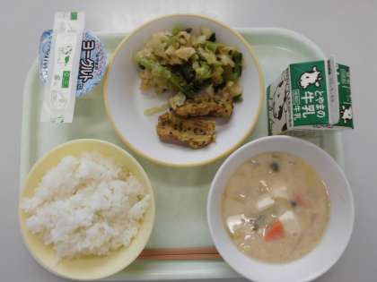 今日の給食は、ごはん、牛乳、ちくわのカレーあげ、しょうがひたし、とうにゅう汁、ヨーグルトです。