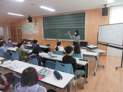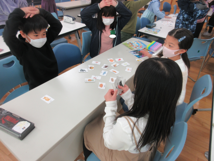 外国語活動では、ホワイトボードに映っているシルエットを見て、何のシルエットか当てるゲームをしました。シルエットを見て、「Apple!」「House!」と元気よく答えていました。その後は外国語を使ったカルタも行い、外国語の表現に親しみました。