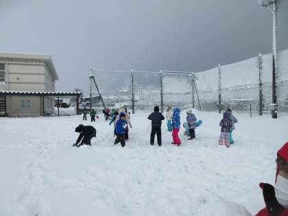 グラウンドに降り積もった雪。全校で1番乗りに雪遊びをしました。まずは、的当て雪合戦用の的を、色団ごとに作り雪玉を投げ合いました。
