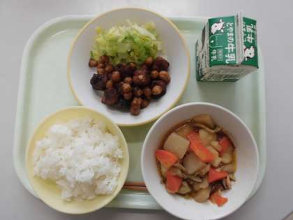 今日の給食は、ごはん、魚と豆のえごまみそがらめ、ゆでキャベツ、ちくぜんだき、牛乳です。