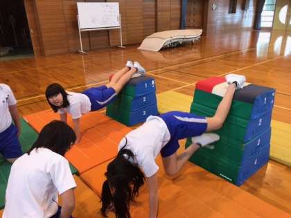倒立系の技に挑戦する前段階として、手押し車や壁登り倒立等に挑戦しています。