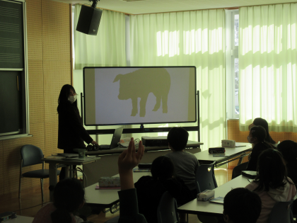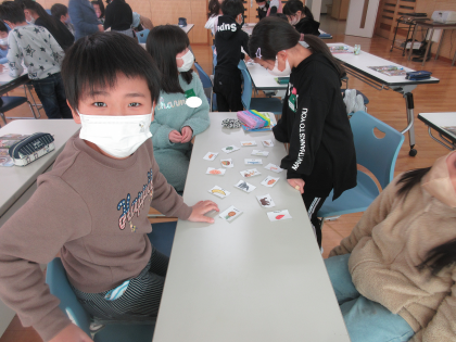 外国語活動では、画像がどんな物を表しているかクイズをしました。子供たちは想像力を働かせて、答えをどんどん発表していました。その後のカルタも、友達と楽しく活動していました。