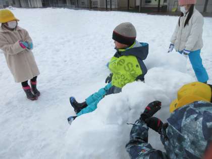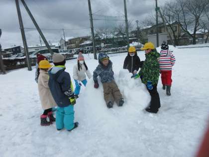 今日は、時折雪が吹雪いているような天候でしたが、雪の降る中で子供たちは元気よく雪遊びをしました。子供たちのパワーに、途中からは雪も止み、思う存分雪遊びを楽しんでいました。