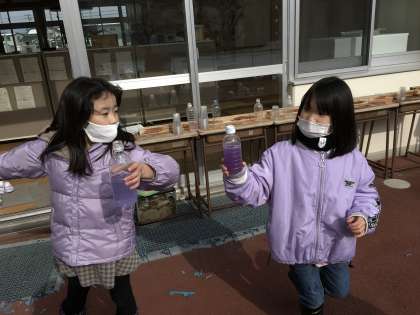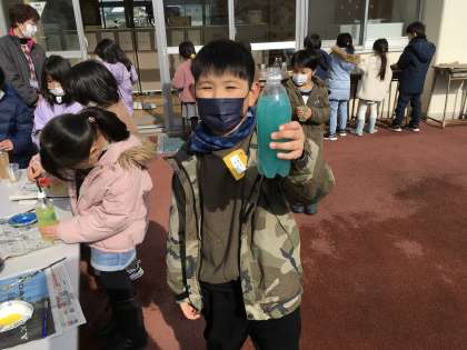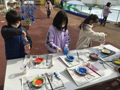 図工で色水遊びをしました。赤・黄・青の絵の具を使って様々な色水を作って楽しみました。雪の上にカップを置いたり、雪に色水をまいたりして楽しく過ごしました。