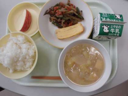 今日の給食は、ごはん、あつやきたまご、まかしときっきのきんぴらごぼう、ツネタのみそしる、りんご、牛乳です。