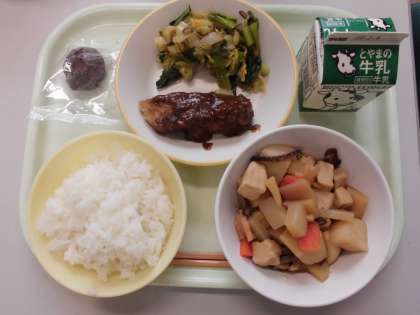 今日の給食は、ごはん、魚のねぎみそかけ、ゆず昆布あえ、ふきよせ煮、おはぎ、牛乳です。
