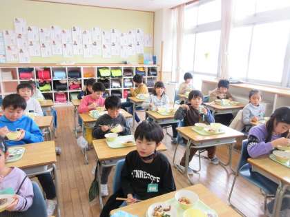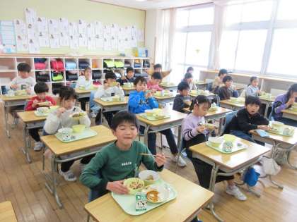 今週は給食週間で、毎日「本」にちなんだ楽しい献立が出て、楽しく、おいしく給食をいただいています。ただ、今はコロナ予防のため、元気な2花の子供たちも黙食に心がけています。でも、食べている顔は、にこにことおいしそうですね。