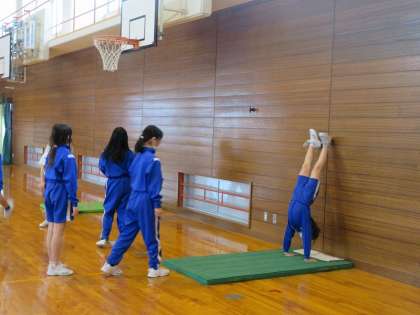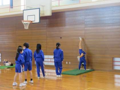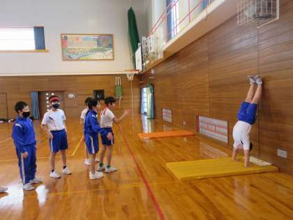 体育科ではマット運動に取り組んでいます。なわ跳びで体をあたためた後、かべ倒立に挑戦しています。手をつく場所や視線の方向等、ポイントを意識して練習を繰り返しました。「できるようになったよ」とうれしそうに報告にくる子供が増えています。