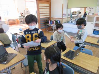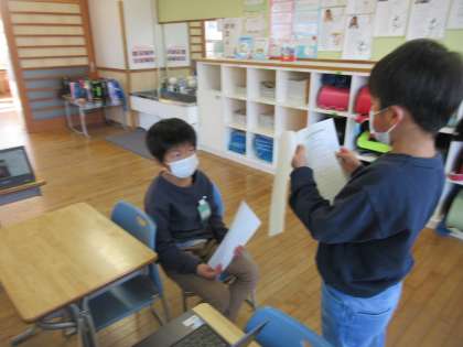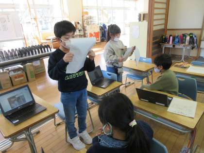 生活科「ぼく・わたしたんけん」で家から持ってきた思い出の写真をタブレットのジャムボードに貼りつけ、いろいろなコメントと発表原稿を作りました。本来なら今週末の授業参観の時に、家の人の前で発表する予定でしたが、残念ながら中止となり、土曜日は学級の友達の前で発表することになります。今日は、隣のペアの友達と聴き合いをして、アドバイスをもらい、発表に磨きをかけました。
