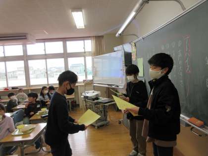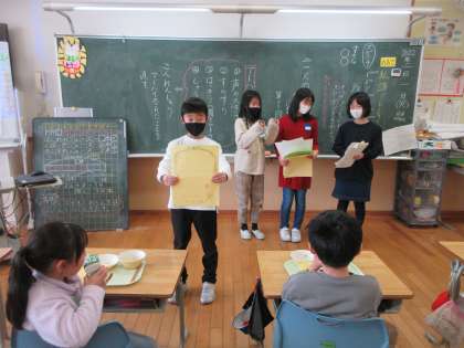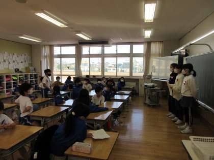 今日は、朝は5年生、昼は4年生がお知らせに来てくれました。5年生は「卒業を祝う会」のこと。4年生は「総合的な学習」で行ったウォークラリーについて。2年生は、上級生の活動を興味津々に聴き、質問をしたりお礼を言ったりしていました。上級生の姿が、よい写しとなってくれることでしょう。