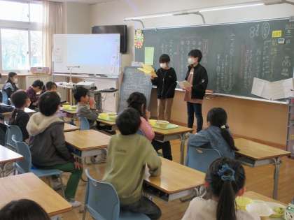 これまで環境について調べたことを、ポスターにしたり、4コマ漫画にしたり、クイズラリーを行ったりして、たくさんの人に知ってもらう活動をしてきました。3学期に入り、ポスターを貼り替えたり、クイズラリーに参加してくれた学年に賞状やクイズの答えを渡したりしています。
